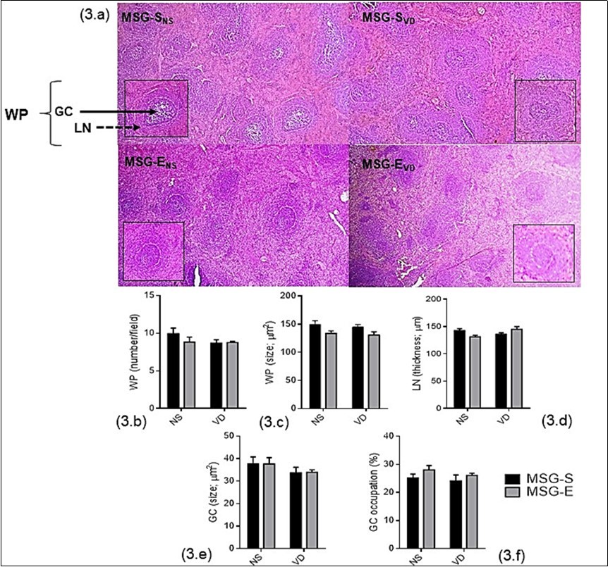 Interestingly, we observed that VD supplementation promoted an augmentation in the WP area, as well as in the GC area, in spleens from CON lean rats, without altering histological aspects in spleens of MSG-obese rats. VD supplementation can elevate secretion of IL-2 and the proliferation index of T lymphocytes in the spleens of immunosuppressant mice 39 and, in HFD-obese mice, VD supplementation improves spleen morphology, inducing increased WP, with proliferation of LN and augmented immune activity in the spleen 33. These, data suggest that VD supplementation was unable to attenuate or revert the splenic histological abnormalities induced by neonatal MSG treatment. However, changes, induced by VD, in spleen functionality cannot be disregarded. Jin et al. (2018) demonstrated that intraperitoneally-administered VD induced the infiltration of Treg cells in secondary immune organs, such as the spleen and lymphatic nodes 40. Moreover, as mentioned, MSG-obese rats do not produce GH, but present excessive cortisol levels, events that could prevent the effects of VD on the spleen. Further studies are necessary to clarify these hypotheses in the MSG-obese model.