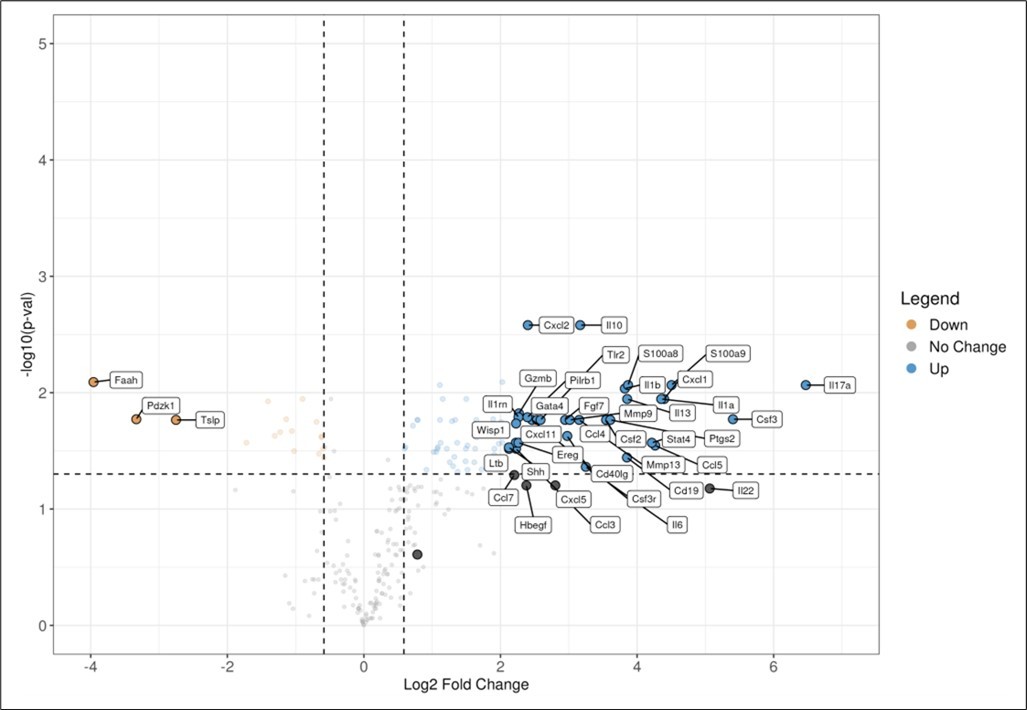 Figure 1.Volcano plot demonstrating statistically significant upregulation and downregulation of genes in periwound tissue at Day 14 following treatment with the NerveStim™ Neuropathy System, as assessed by NanoString gene expression profiling.